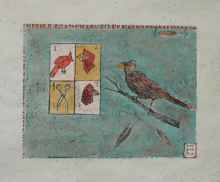 < Emily > 18"x14" This eye-catching female cardinal molted all but one of the feathers on her head crest leaving the lone feather to flop around in a comical way. Emily is given a choice of three crest styles that she can dream about for her new feather coiffure.