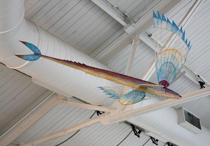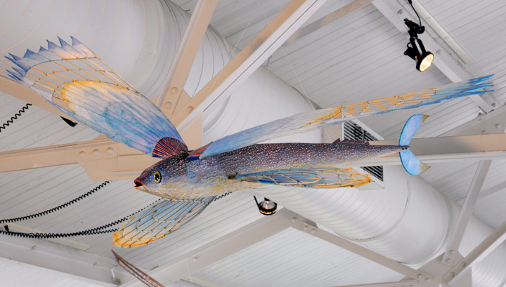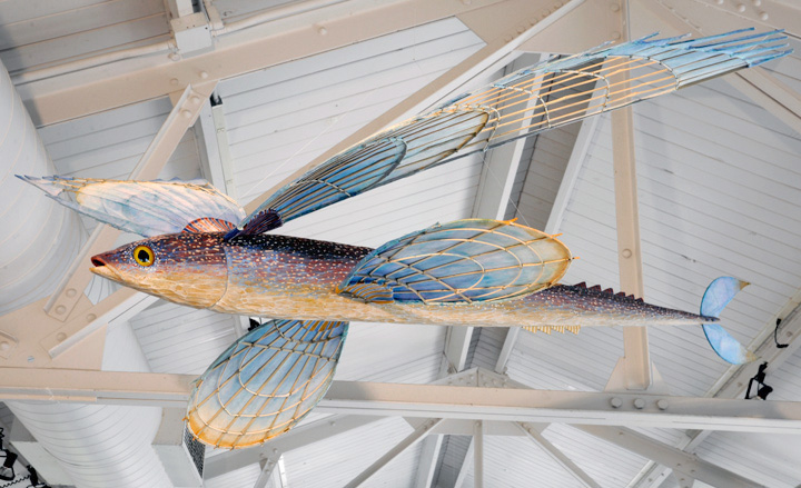 < Flying Fish > Wood, bamboo, paper, paint; glass eyes 29”x53”x70.5”