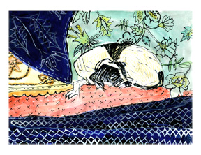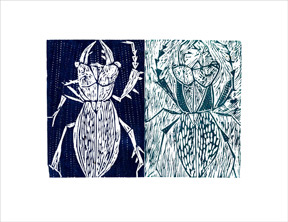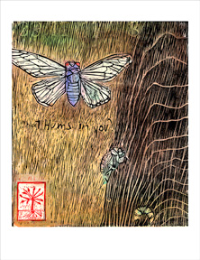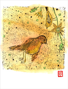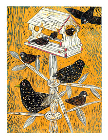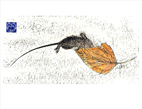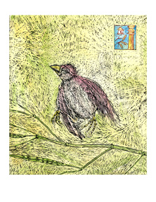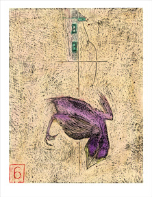 In this print, the incident of a baby sparrow falling from the nest is depicted in a somewhat detached way, maybe suggesting that the bird might have been too active for its own good. The sparrow is shown on its back with a crushed beak, broken wings and a brush of blood-like pink on its chest. Lines radiate out from the bird suggesting both the impact of the fall and the eventual disappearance of the corpse as it is carried off, bit by bit, by flies and other insects. The prominent image of the fly, framed in the upper left hand corner, indicates its significant role in cleaning up scenes of violence in the natural world.