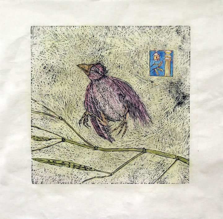 Marilyn portrays dead animals in part because they stay still while she draws them. This cardinal was found lying by a bamboo branch beneath the bird feeder.