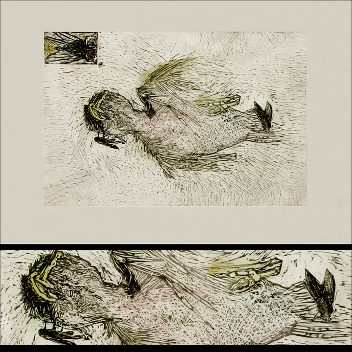 In this print, the incident of a baby sparrow falling from the nest is depicted in a somewhat detached way, maybe suggesting that the bird might have been too active for its own good. The sparrow is shown on its back with a crushed beak, broken wings and a brush of blood-like pink on its chest. Lines radiate out from the bird suggesting both the impact of the fall and the eventual disappearance of the corpse as it is carried off, bit by bit, by flies and other insects. The prominent image of the fly, framed in the upper left hand corner, indicates its significant role in cleaning up scenes of violence in the natural world.