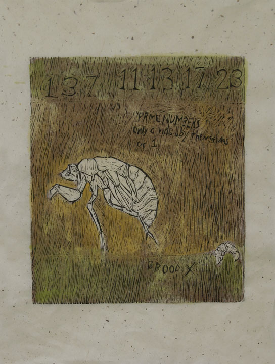 The numbers and words incorporated into this print’s composition refer to the fact that both annual and periodic cicadas emerge as nymphs to begin their adult lives after living underground for periods of years that are always prime numbers. Brood X, cited in this print, has the greatest range and concentration of any of the 17 year cicadas. In 2004, during the most recent emergence of Brood X, Marilyn was fascinated to observe the huge numbers of adult cicadas and the high decibel, rhythmic “singing” of the males during frenziedmating activities.