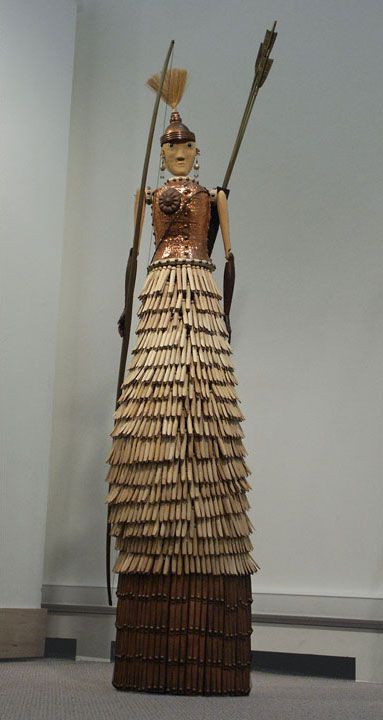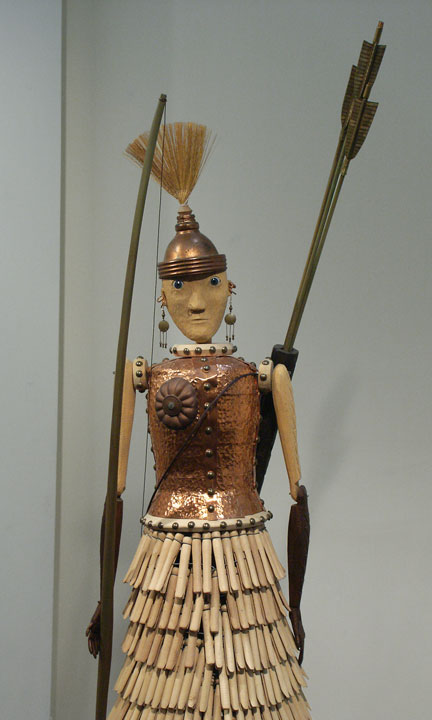 < Antonia > 80"x16"x24" carved & painted wood, copper, found objects, mixed media