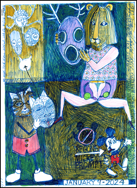 <1-9-2024 Cat & Mickey> Pen and Watercolor 10" x7" <1-9-2024 Cat & Mickey> Pen and Watercolor 10" x7"