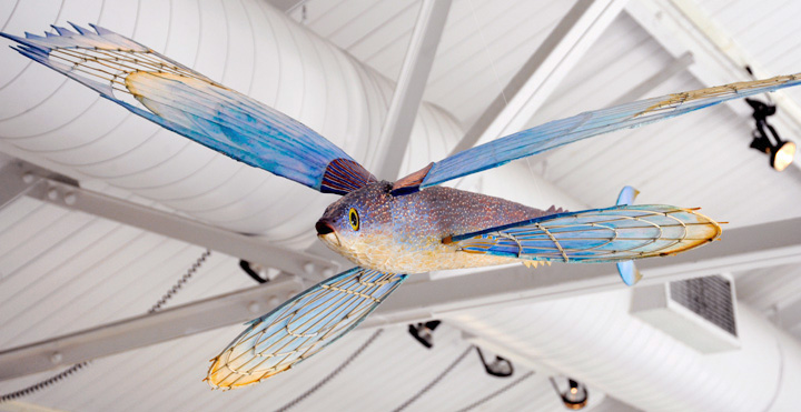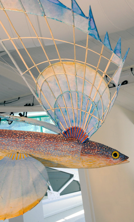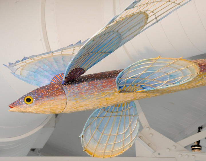 < Flying Fish > Wood, bamboo, paper, paint; glass eyes 29”x53”x70.5”